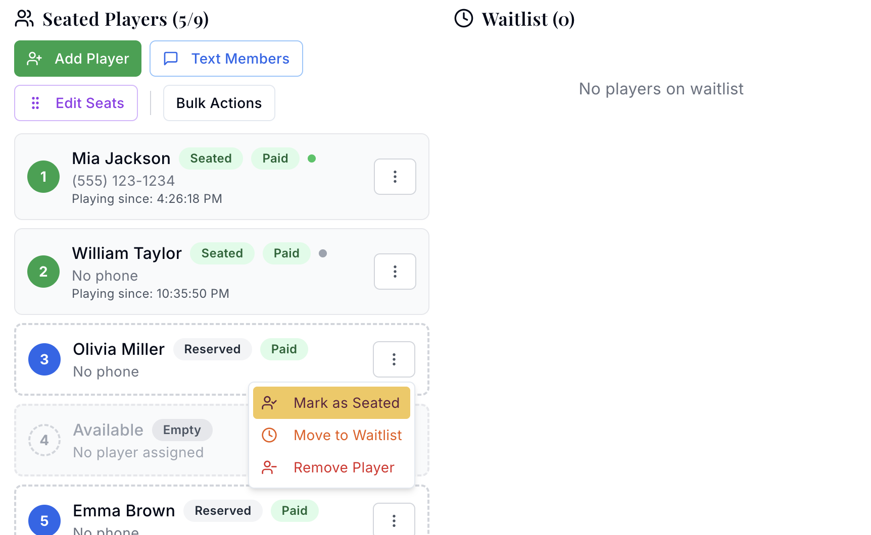 Track every table in your room from a single dashboard. Monitor available seats, see who's playing, and manage waitlists and seat tracking in real-time. When a seat opens, the next player is notified instantly. No more shouting across the room or manual lists.