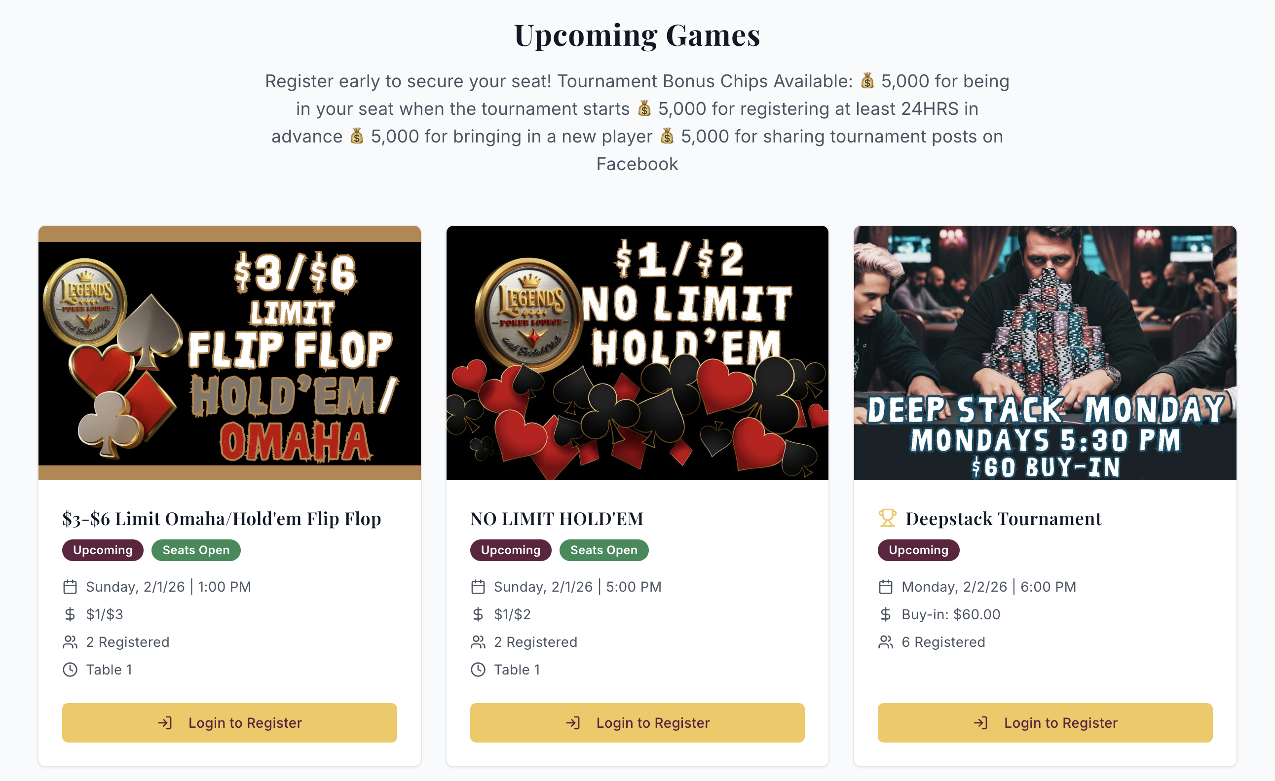 Players can register for games directly through your site. They see live table status, available seats, and estimated wait times. When their seat is ready, they get an SMS notification. It's the modern experience players expect from a professional room.
