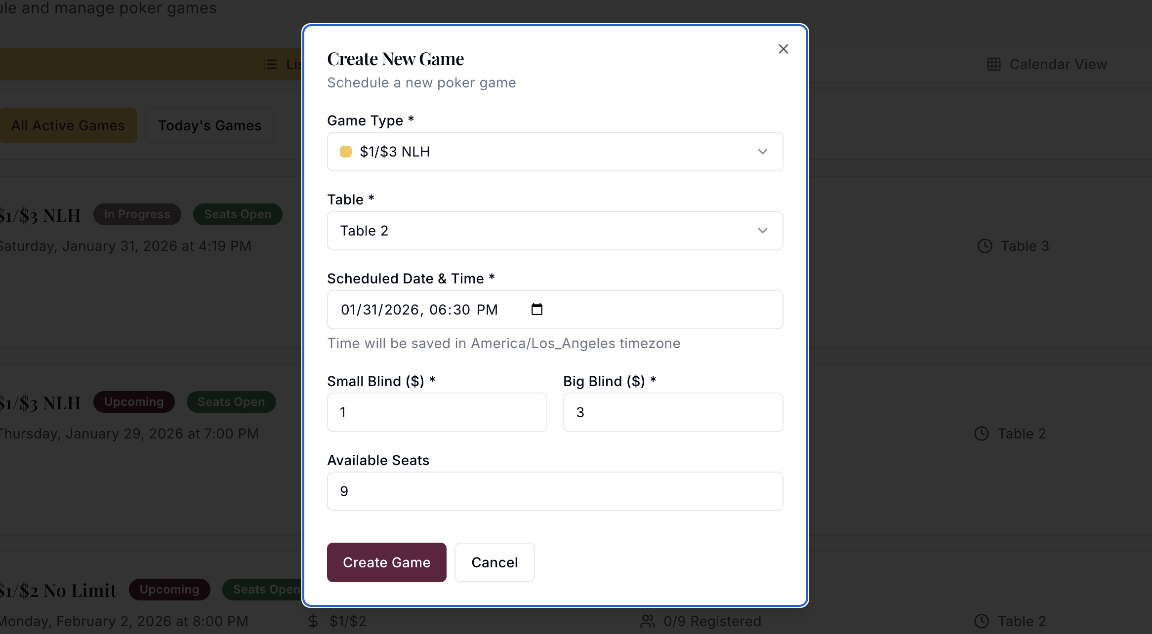 Schedule cash games in minutes