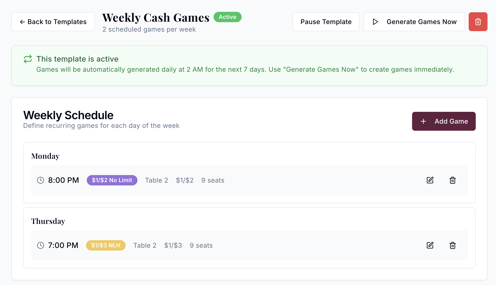 Set regular recurring weekly games for the system to automatically generate on a rolling 7-day period. Created games are fully editable if you need to make changes from week-to-week.